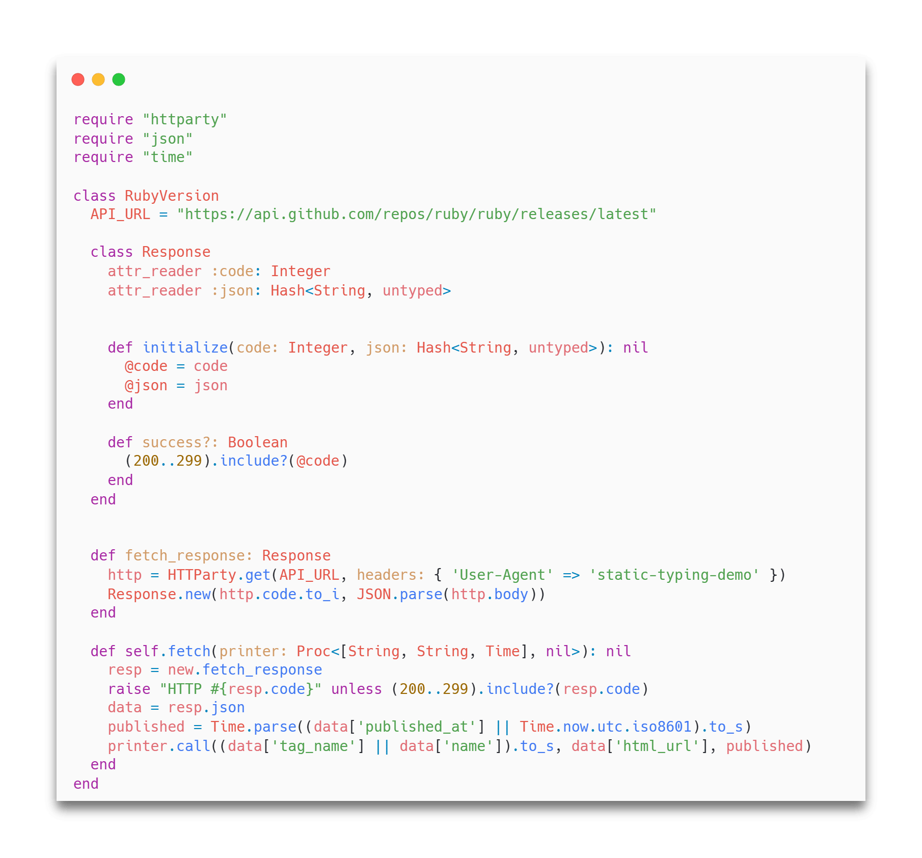 Static typing is a formidable tool that brings immense value to codebases of all sizes. From tiny scripts to massive monoliths, the benefits are hard to ignore: you get live documentation that is always up to date, enhanced readability, and a reliable safety net that significantly boosts code reliability. Different dynamic languages have taken various paths to solve the typing puzzle. Python introduced native but optional type hints, while the JavaScript ecosystem moved toward a separate language entirely with TypeScript. Within the Ruby community, we’ve seen two distinct implementations in RBS and Sorbet, which have recently begun to converge thanks to the introduction of RBS inline and Sorbet’s support for it. However, the current Ruby approach isn’t without its friction. For many developers, typing still feels like a matter of personal preference rather than a core requirement. We never forget to write tests because they are the heartbeat of our CI/CD pipelines, but because type checking is often seen as “extra,” it is far too easy for static checks to be ignored or forgotten entirely. There is a groundbreaking experiment currently gaining traction called T-Ruby. Unlike standard runtime type-checking systems, T-Ruby compiles typed code down to pure, undecorated Ruby with zero runtime overhead. If you are looking for a shorthand description, T-Ruby is essentially TypeScript for the Ruby language. It acts as a layer on top of the language where you write RBS-inspired code that is eventually compiled into plain, standard Ruby. While some might ask why we shouldn’t just use Crystal, there is a fundamental difference in philosophy. Crystal is a separate, Ruby-like language with its own ecosystem. T-Ruby, by contrast, is an extra layer specifically designed to stay close to the Ruby we already know. Much like how TypeScript eventually outputs plain JavaScript, T-Ruby ensures your final product remains pure Ruby. To demonstrate this, I’ve updated a script I originally used in 2025 to showcase RBS. This is a simple HTTP client that fetches the latest Ruby release tag from GitHub. With T-Ruby, we can now embed types directly into the class structure: By adding these types, we can strictly define the structure of our Proc and ensure the data passed through the system is valid. In standard Ruby, we would normally rely on documentation or manual guard clauses to achieve this level of certainty. Setting up the environment is straightforward: a quick The integration with Rails is currently one of the more experimental aspects. Because Rails relies on a specific folder structure, the cleanest approach seems to be storing the entire app folder within your T-Ruby source directory. Files that don't contain T-Ruby syntax are simply copied over to the destination folder unmodified. This mirrors the Is the future finally here? Not quite. T-Ruby is very much in a "technical preview" phase. While the website and documentation look professional and polished, the implementation can be temperamental. During my testing, I found that even official examples could fail immediately after installation. However, the potential is undeniable. While working on a small Rails app with T-Ruby, I realized I no longer needed a separate collection of RBS files. Writing types alongside business logic feels natural, and knowing the code is "type-correct" at compile time provides a unique peace of mind. It’s a bold step forward for the Ruby ecosystem even if it isn't quite ready for your production environment just yet. |